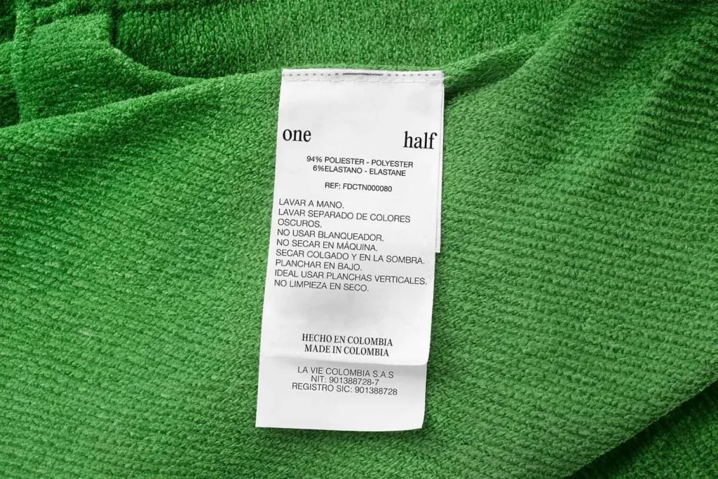 Indica la composición y el uso adecuado del lavado de la prenda y la reglamentación legal nacional e internacional.